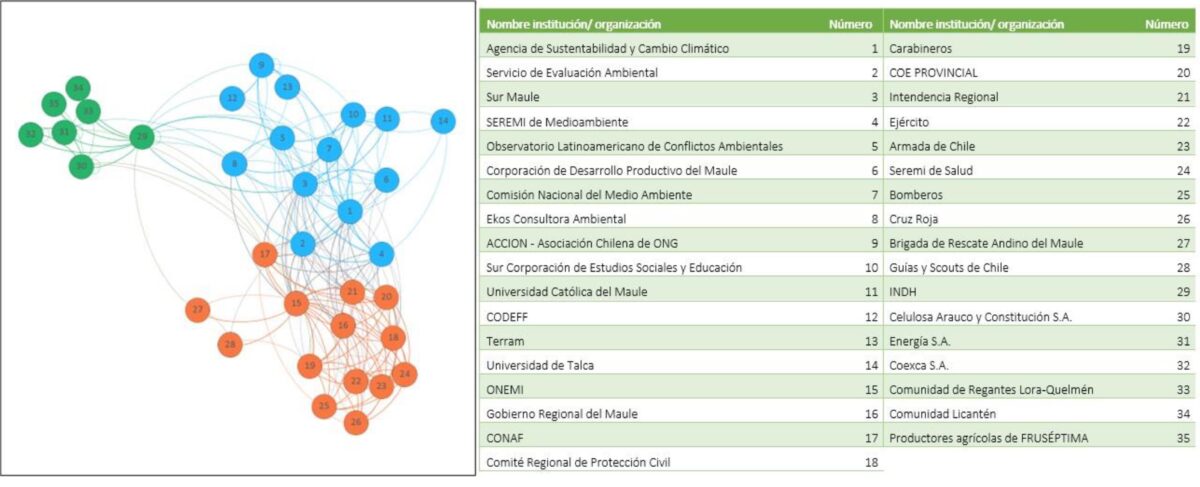 The groups of agents within this governance network of the Maule Region represent three narratives on how the risk of forest fires is addressed, each one linked to a different meaning and way of acting around these disasters. The governance network depicted in this figure shows a high level of interconnection between the agents associated with risk management and the production of knowledge about forest fires, groups that are also internally highly connected. On the other hand, the link between these groups and community agents is weak. A better and greater integration of this type of agency is one of the main challenges that must be addressed to strengthen the governance of forest fires.