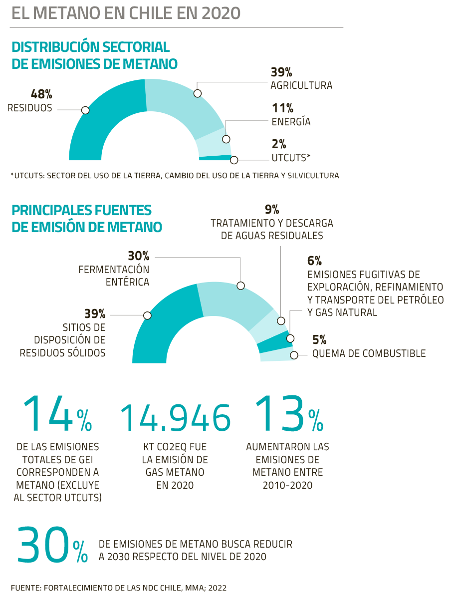 Chile se comprometió en la última COP27, en sus NDC, a reducir emisiones de este gas. Las principales fuentes de emisión, son los residuos orgánicos en rellenos y el ganado.