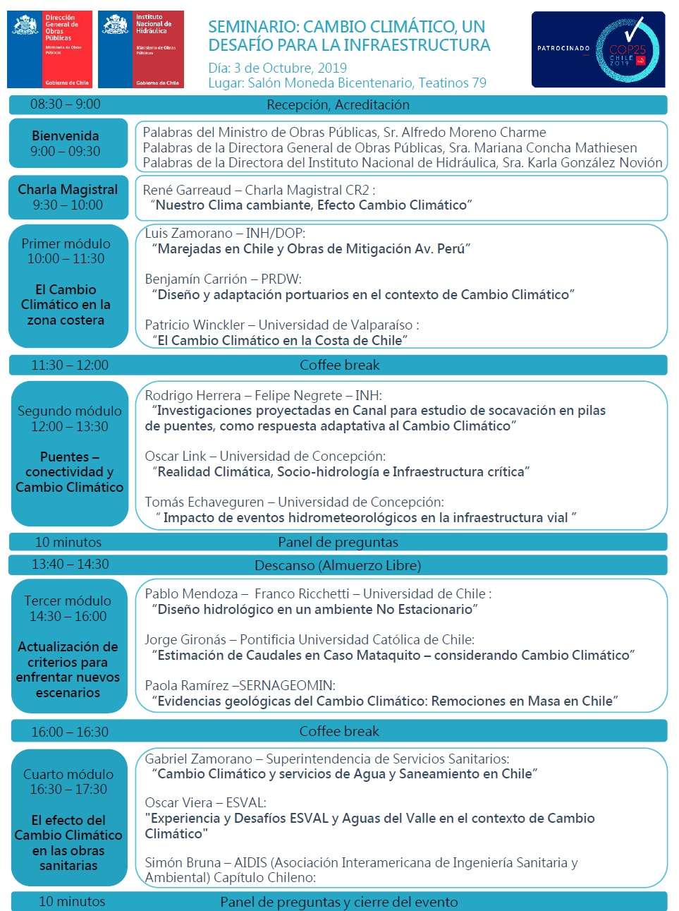 En línea con la COP25, la cumbre sobre el Cambio Climático más importante del mundo y que tendrá lugar en Chile en diciembre del 2019, el Instituto Nacional de Hidráulica ha organizado este seminario para crear un espacio de conversación y colaborar con la co-construcción del tema principal: el Cambio Climático y los desafíos que este conlleva en relación a la Infraestructura y su Adaptabilidad.