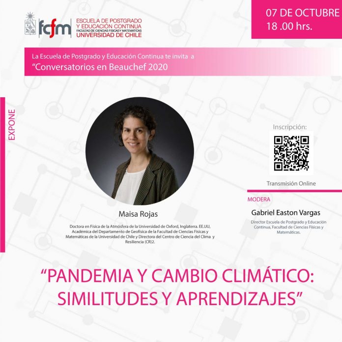 La Escuela de Postgrado y Educación Continua de la Facultad de Ciencias Físicas y Matemáticas U. de Chile, invita a un nuevo conversatorio «Pandemia y Cambio climático: similitudes y aprendizajes», en donde participará Maisa Rojas, directora del Centro de Ciencia del Clima y la Resiliencia (CR)2 y académica del Departamento de Geofísica FCFM U. de Chile.