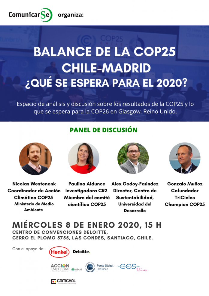 El encuentro estará conformado por un panel integrado por representantes de la Ciencia, el Ministerio de Medio Ambiente y el sector privado, que abordará los resultados de la Conferencia de Naciones Unidas sobre el Cambio Climático (COP25) bajo la presidencia de Chile. Este panel contará con Nicolas Westneck, Coordinador Acción Climática COP25, Ministerio de Medio Ambiente de Chile; Paulina Aldunce, Investigadora de (CR)2 y miembro del comité científico COP25; Alex Godoy-Faúndez, Director, Centro de Sustentabilidad, Universidad del Desarrollo y Gonzalo Muñoz, CEO de TriCiclos, Champion COP25.