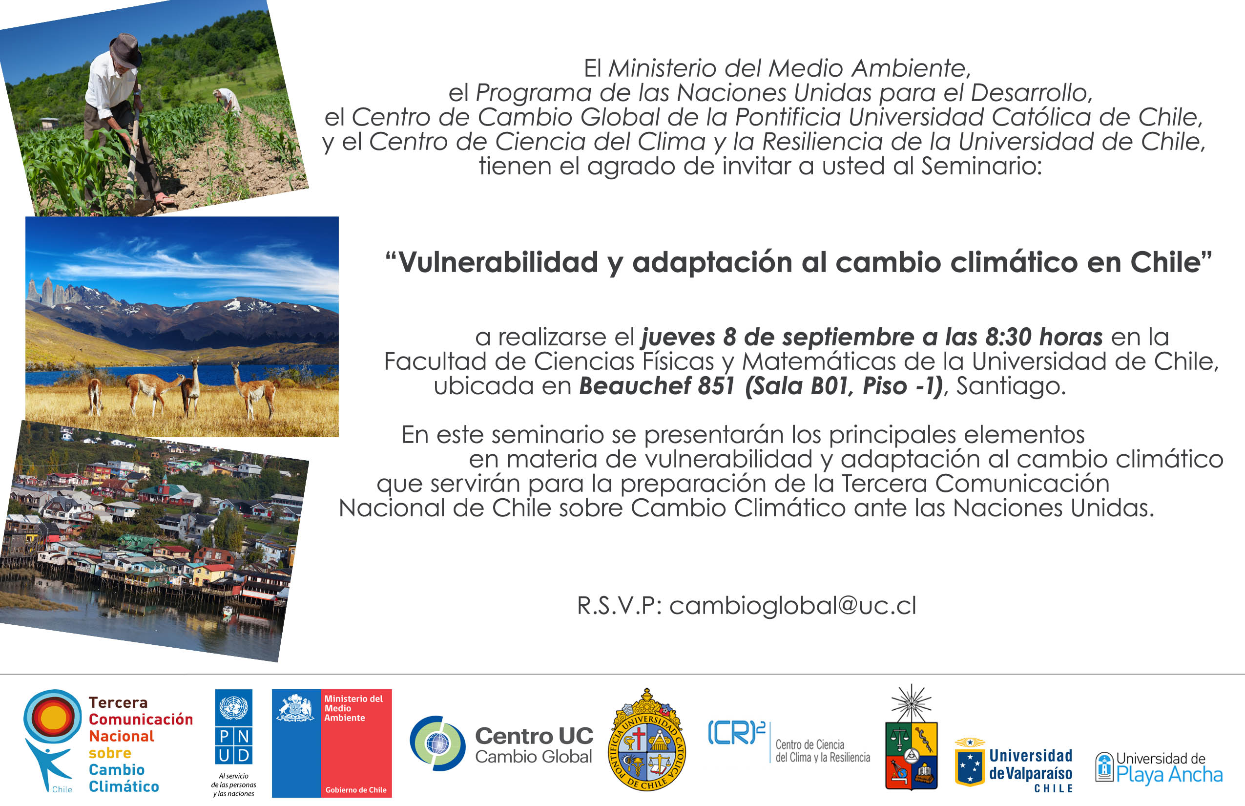 El Ministerio del Medio Ambiente, el Programa de Naciones Unidas para el Desarrollo, el Centro de Cambio Global de la PUC y el (CR)2 invitan al seminario «vulnerabilidad y adaptación al cambio climático en Chile» donde se presentarán los elementos para la preparación de la Tercera Comunicación Nacional de Chile sobre Cambio Climático ante Naciones Unidas.