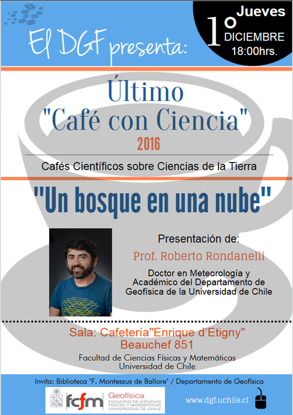 El Departamento de Geofísica FCFM de la Universidad de Chile invita al último «Café con ciencia» del año 2016, que se realizará el jueves 1 de diciembre a las 18 hrs en la Cafetería Enrique D’Etigny (Beauchef 851, Santiago).
