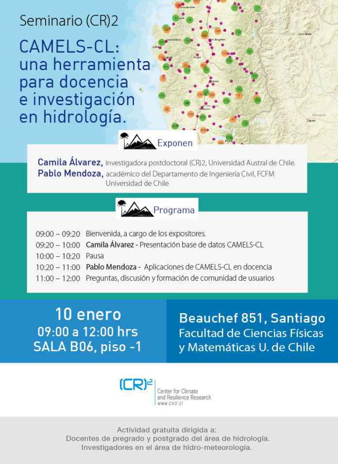 El Centro de Ciencia del Clima y la Resiliencia (CR)2 invita al seminario «CAMELS-CL: una herramienta para docencia e investigación en hidrología”, dictado por Camila Álvarez, investigadora postdoctoral (CR)2, Universidad Austral de Chile, y Pablo Mendoza, académico del Departamento de Ingeniería Civil, FCFM Universidad de Chile.
