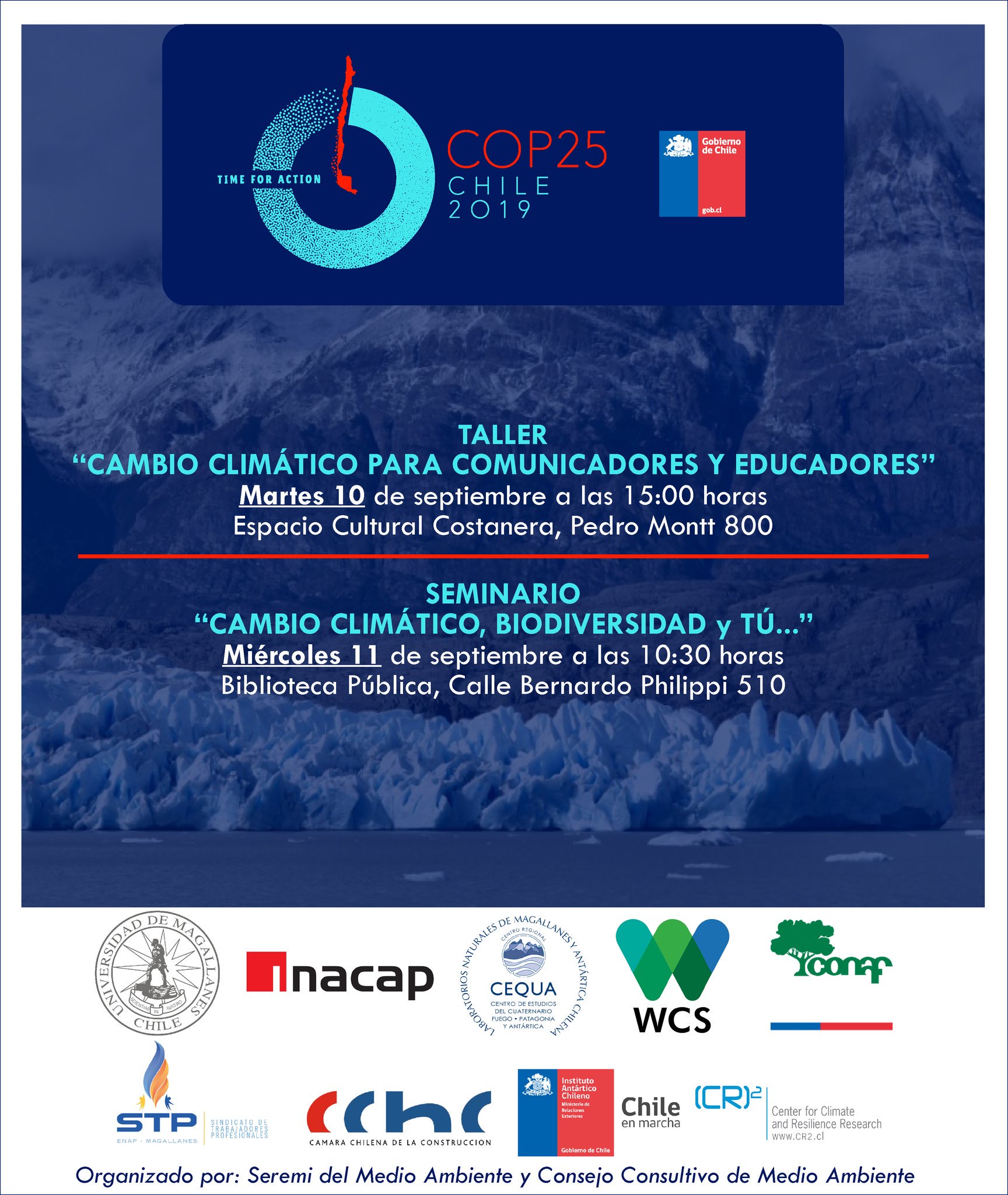 La Seremi de Medio Ambiente de Magallanes junto al Consejo Consultivo de Medio Ambiente, invitan a participar en la agenda de actividades que se realizarán en Puerto Natales durante septiembre, enmarcadas bajo la COP 25 :
