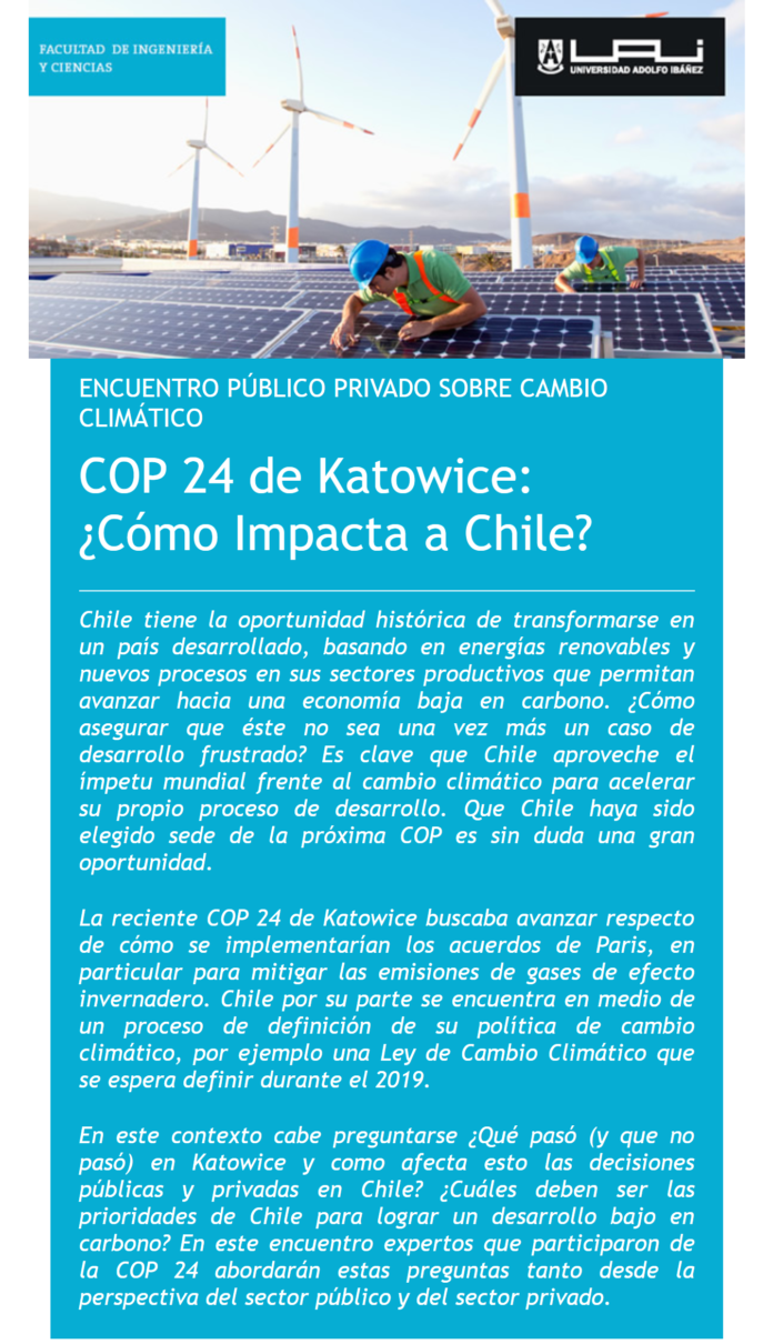 El Centro de Ciencia del Clima y la Resiliencia (CR)2, y el Centro iUAI Earth de la Universidad Adolfo Ibáñez, invitan al Encuentro público privado sobre cambio climático «COP24 de Katowice: ¿Cómo impacta a Chile?».