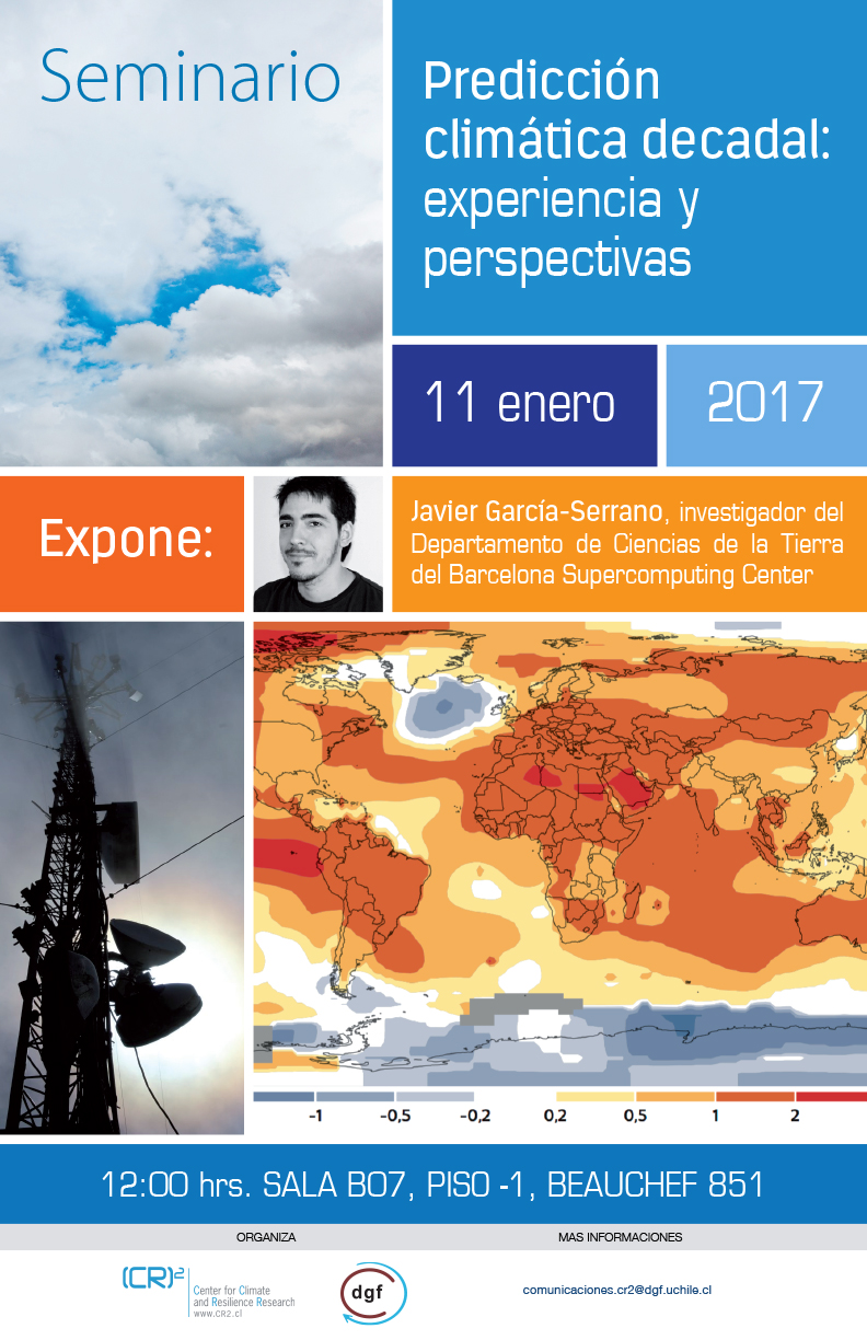 El Centro de Ciencia del Clima y la Resiliencia (CR)2 y el Departamento de Geofísica FCFM Universidad de Chile invitan al seminario «Predicción climática decadal: experiencia y perspectivas” dictado por Javier García-Serrano, investigador del Departamento de Ciencias de la Tierra del Barcelona Supercomputing Center, España.