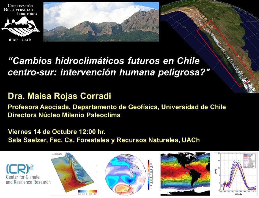 El Instituto de Conservación Biodiversidad y Territorio de la Facultad de Ciencias Forestales y Recursos Naturales de la Universidad Austral de Chile invita cordialmente a la charla «Cambios hidroclimáticos futuros en Chile centro y sur: ¿intervención humana peligrosa?»