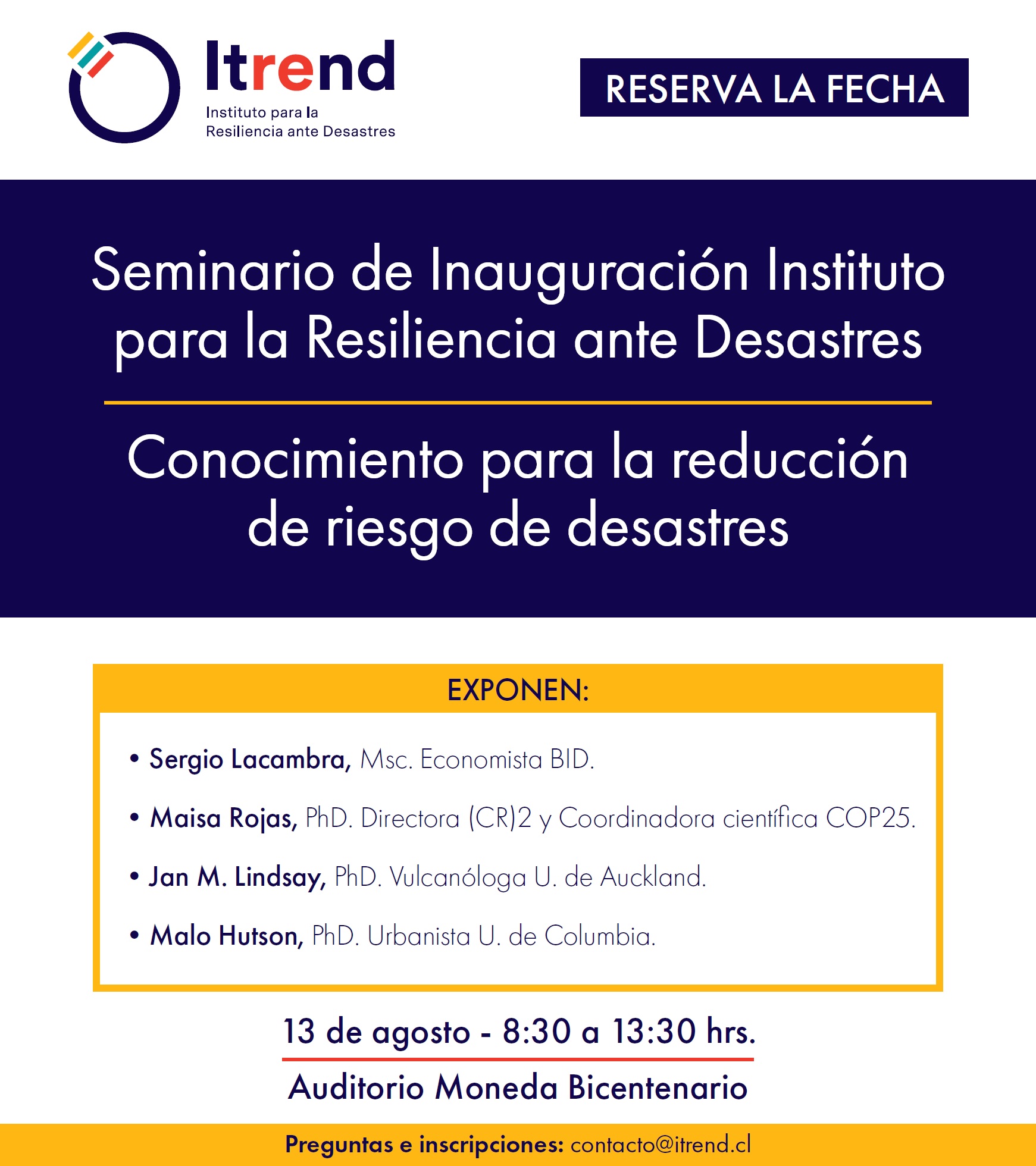 El martes 13 de agosto se realizará el seminario de inauguración del Instituto para la Resiliencia ante Desastres (Itrend), denominado «Conocimiento para la reducción de riesgo de desastres», que contará con la participación de Maisa Rojas, directora del Centro de Ciencia del Clima y la Resiliencia (CR)2 y coordinadora científica de la COP25.