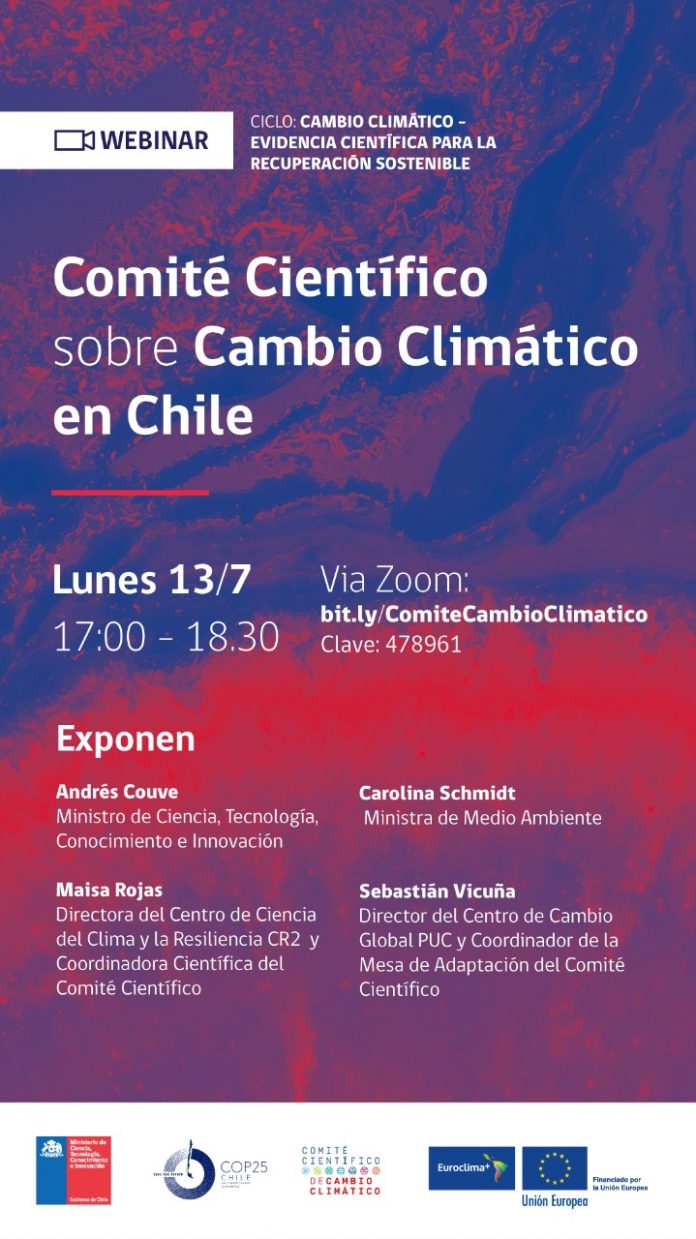El Ministerio de Ciencia, Tecnología, Conocimiento e Innovación y el Comité Científico de Cambio Climático para la COP 25 invitan al webinar «Comité Científico sobre Cambio Climático en Chile». La actividad se realizará este lunes 13 de julio desde las 17 a las 18:30 horas y será transmitida por ZOOM.