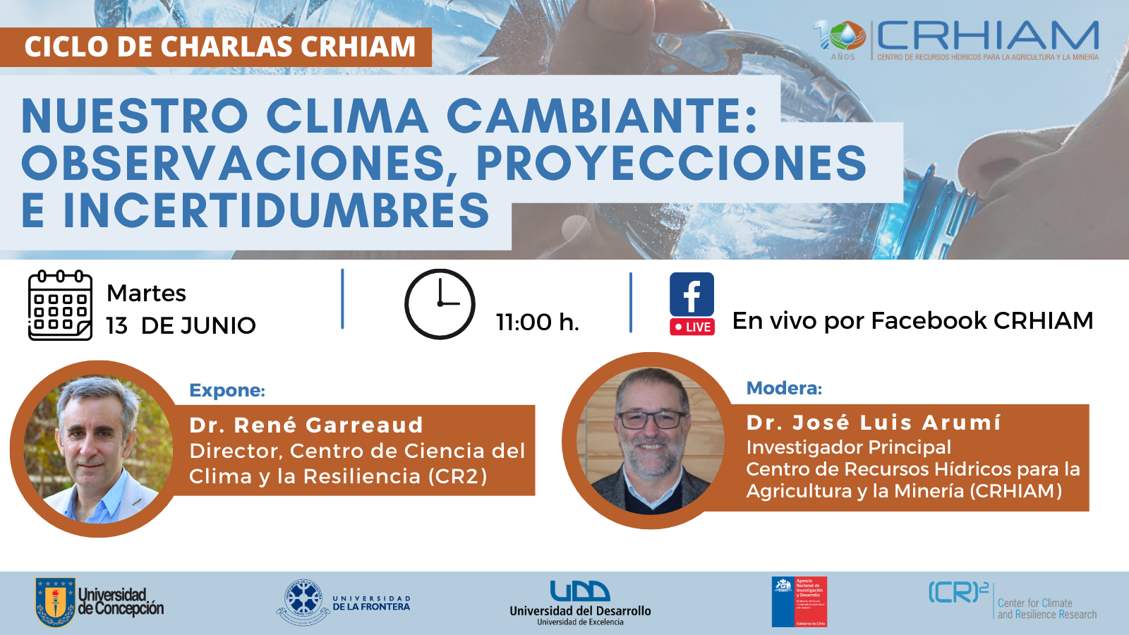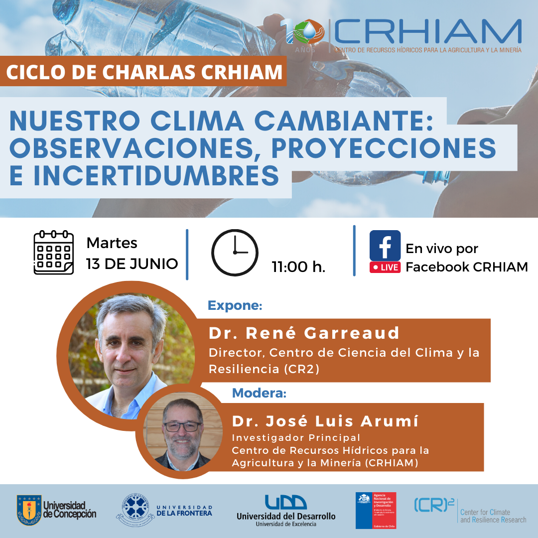 El evento se realizará en el contexto del Ciclo de Charlas del Centro de Recursos Hídricos para la Agricultura y la Minería (CRHIAM), y se transmitirá a través del canal de Facebook de CHRIAM.