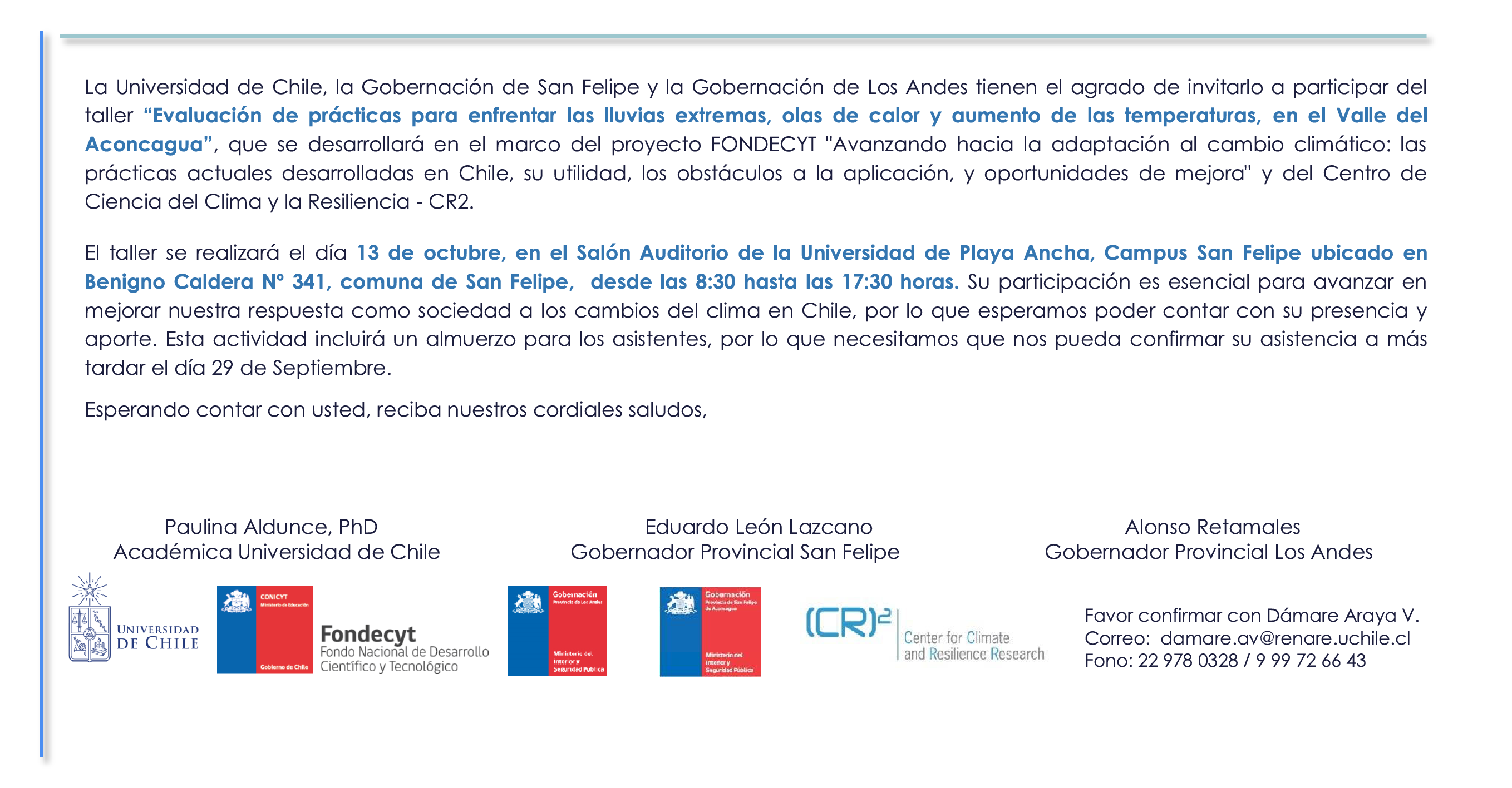 El (CR)2 junto a la Universidad de Chile, la Gobernación de San Felipe y la Gobernación de Los Andes invitan al taller «Evaluación de prácticas para enfrentar las lluvias extremas, olas de calor y aumento de temperatura en el Valle del Aconcagua» que se desarrollará el jueves 13 de octubre desde las 08:30 hrs en el Campus San Felipe de la Universidad de Playa Ancha (Benigno Caldera 341, San Felipe).
