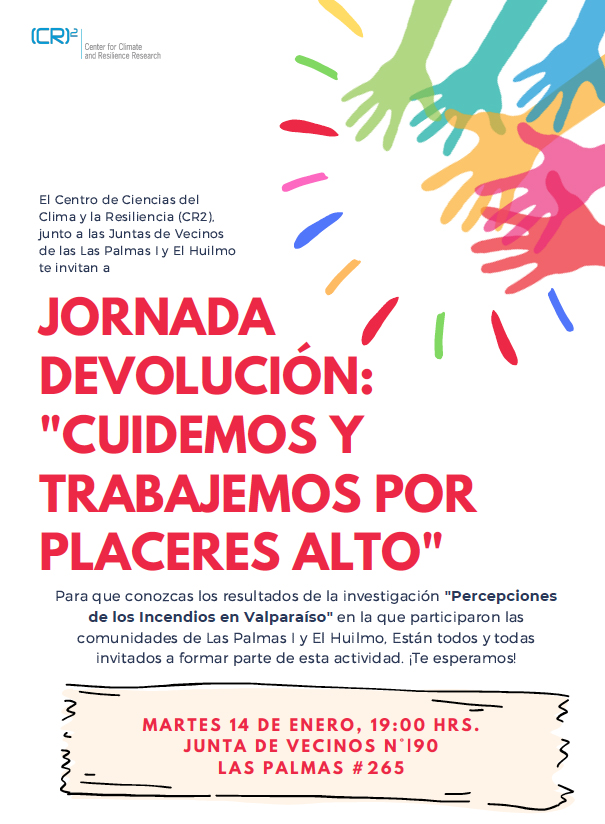 El Centro de Ciencia del Clima y la Resiliencia (CR)2, y las Juntas de Vecinos de Las Palmas I y El Huilmo de Placeres Alto, Valparaíso, invitan a la jornada de presentación de resultados del Informe de Devolución «Trabajando juntos por Placeres Alto: Prevención comunitaria de incendios forestales», que se realizará el martes 14 de enero a las 19 hrs en la Junta de Vecinos Nº190, Las Palmas 265, Valparaíso.