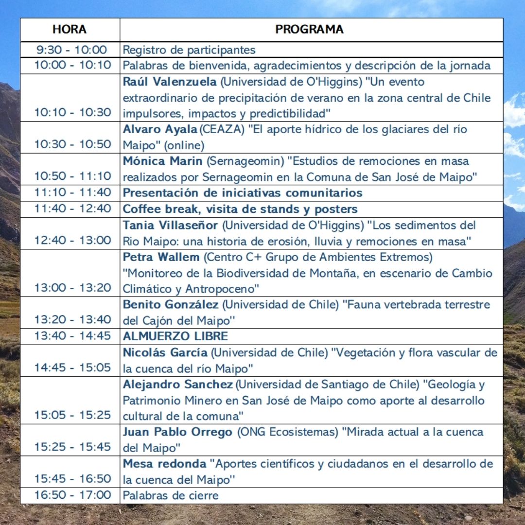 Este evento gratuito convocará a científicos/as e iniciativas ciudadanas trabajando en el Cajón del Maipo con el propósito de generar diálogo y lazos de cooperación entre diferentes actores de la cuenca. Habrán charlas, stands y otras actividades para conocer las últimas investigaciones realizadas en este laboratorio natural acerca de la fauna, la flora, los glaciares, los humedales, los ríos y las amenazas a las que se enfrentan nuestros valiosos ecosistemas.