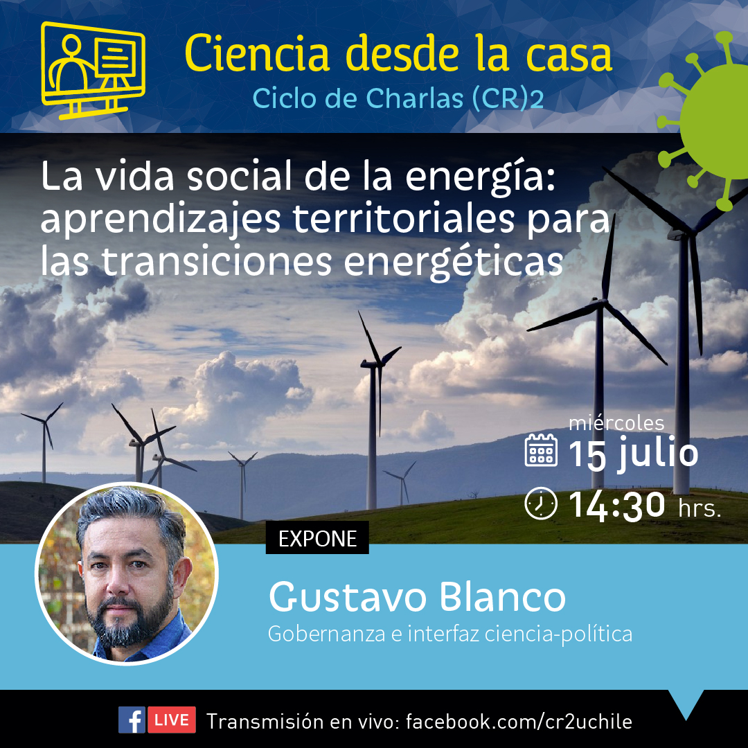 El Centro de Ciencia del Clima y la Resiliencia (CR)2 tienen el agrado de invitar al ciclo de charlas «Ciencia desde la casa», iniciativa completamente online que tiene como objetivo de divulgar la investigación que se realiza en el Centro. Nos acompañará en esta oportunidad Gustavo Blanco, investigador de la línea de Gobernanza e Interfaz Ciencia-Política del (CR)2 y académico de la Facultad de Filosofía y Humanidades UACh, con la charla «La vida social de la energía: aprendizajes territoriales para las transiciones energéticas».