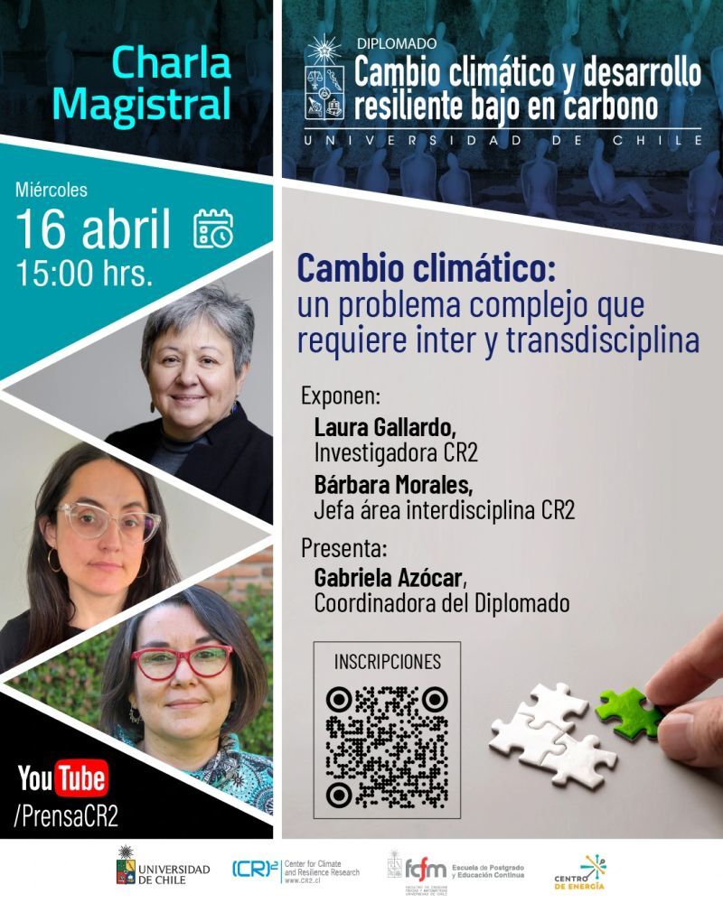 El Centro de Ciencia del Clima y la Resiliencia CR2 y el Centro de Energía de la Universidad de Chile dictarán la charla virtual “Cambio climático: un problema complejo que requiere inter y transdisciplina”, con el objeto de dar a conocer y profundizar en las materias que abordará el diplomado “Cambio climático y desarrollo resiliente bajo en carbono”.