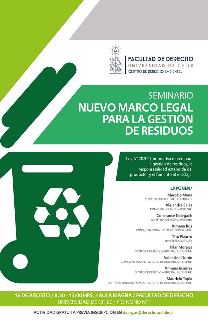 El Centro de Derecho Ambiental de la Facultad de Derecho de la Universidad de Chile invita al seminario «Nuevo marco legal para la gestión de residuos» que se realizará el martes 16 de agosto a las 08:30 hrs en el Aula Magna de la Facultad de Derecho (Pío Nono 1, Providencia).