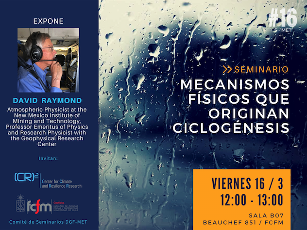El Centro de Ciencia del Clima y la Resiliencia (CR)2 y el Departamento de Geofísica FCFM U. de Chile invitan al seminario “Mecanismos físicos que originan ciclogénesis”, dictado por David Raymond, Atmospheric Physicist at the New Mexico Institute of Mining and Technology, Professor Emeritus of Physics and Research Physicist with the Geophysical Research Center.