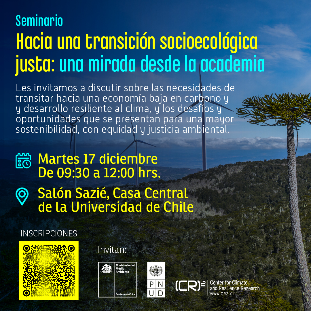 El Centro de Ciencia del Clima y la Resiliencia CR2 y el Ministerio del Medio Ambiente le invitan al Seminario Hacia una Transición Socioecológica Justa: una mirada desde la academia, a desarrollarse el martes 17 de diciembre, entre 9:30 y 12:00 hrs en el Salón Sazié de la Casa Central de la Universidad de Chile. En el seminario discutiremos sobre las necesidades de transitar hacia una economía baja en carbono y un desarrollo resiliente al clima y los desafíos y oportunidades que esto presenta para la realidad nacional y su diversidad territorial desde la mirada de la academia.