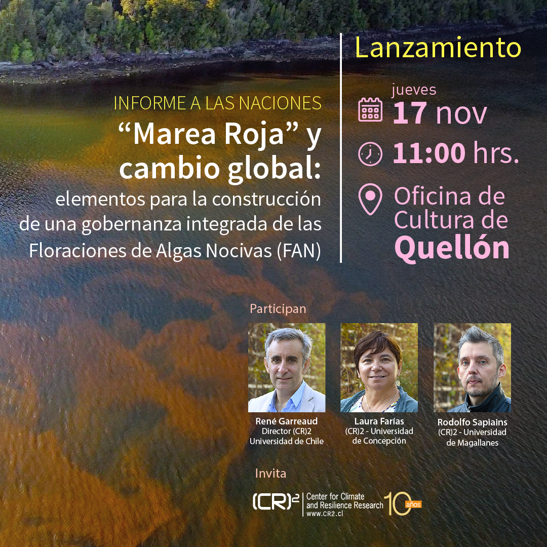 Este jueves 17 de noviembre a las 11:00 hrs se realizará en Quellón, Chiloé, el lanzamiento del Informe a las Naciones elaborado por el Centro de Ciencia del Clima y la Resiliencia (CR)2 que lleva como título «Marea Roja» y cambio global: elementos para la construcción de una gobernanza integrada de las Floraciones de Algas Nocivas (FAN).