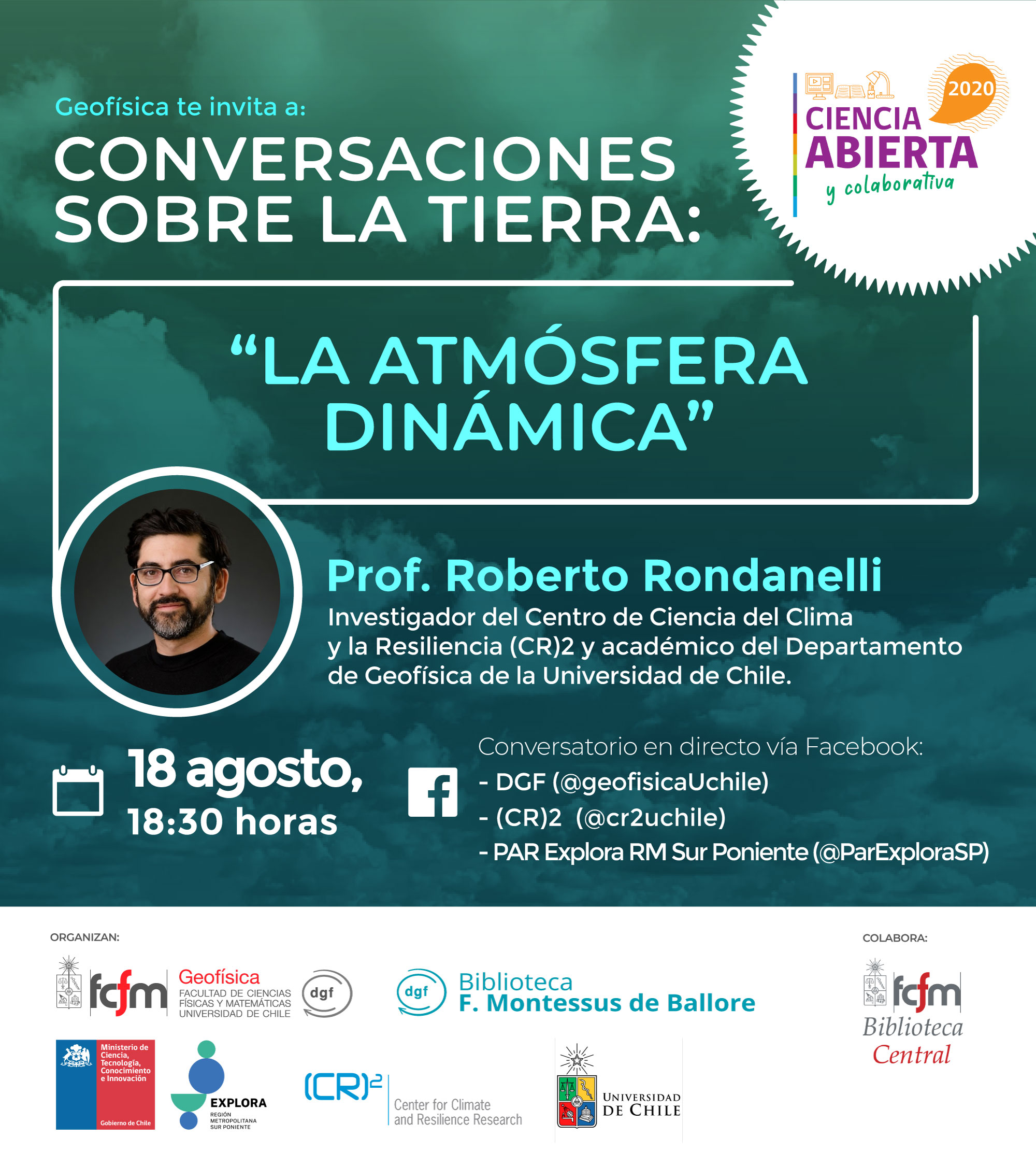 El Departamento de Geofísica FCFM U. de Chile y la Biblioteca F. Montessus de Balore, junto al Par Explora RM Sur Poniente y el (CR)2 tienen el agrado de invitar al ciclo de charlas «Conversaciones sobre la tierra». En esta ocasión nos acompañará Roberto Rondanelli, investigador del (CR)2 y académico del Departamento de Geofísica FCFM U. de Chile, con la charla «La atmósfera dinámica».