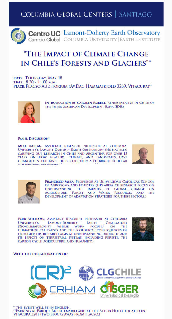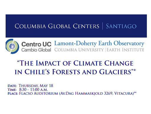 El Centro de Cambio Global UC, junto al Earth Institute de la Universidad de Columbia invitan al seminario «The impact of climate change in Chile’s Forests and Glaciers», con la participación de destacados expositores, tanto nacionales como internacionales.