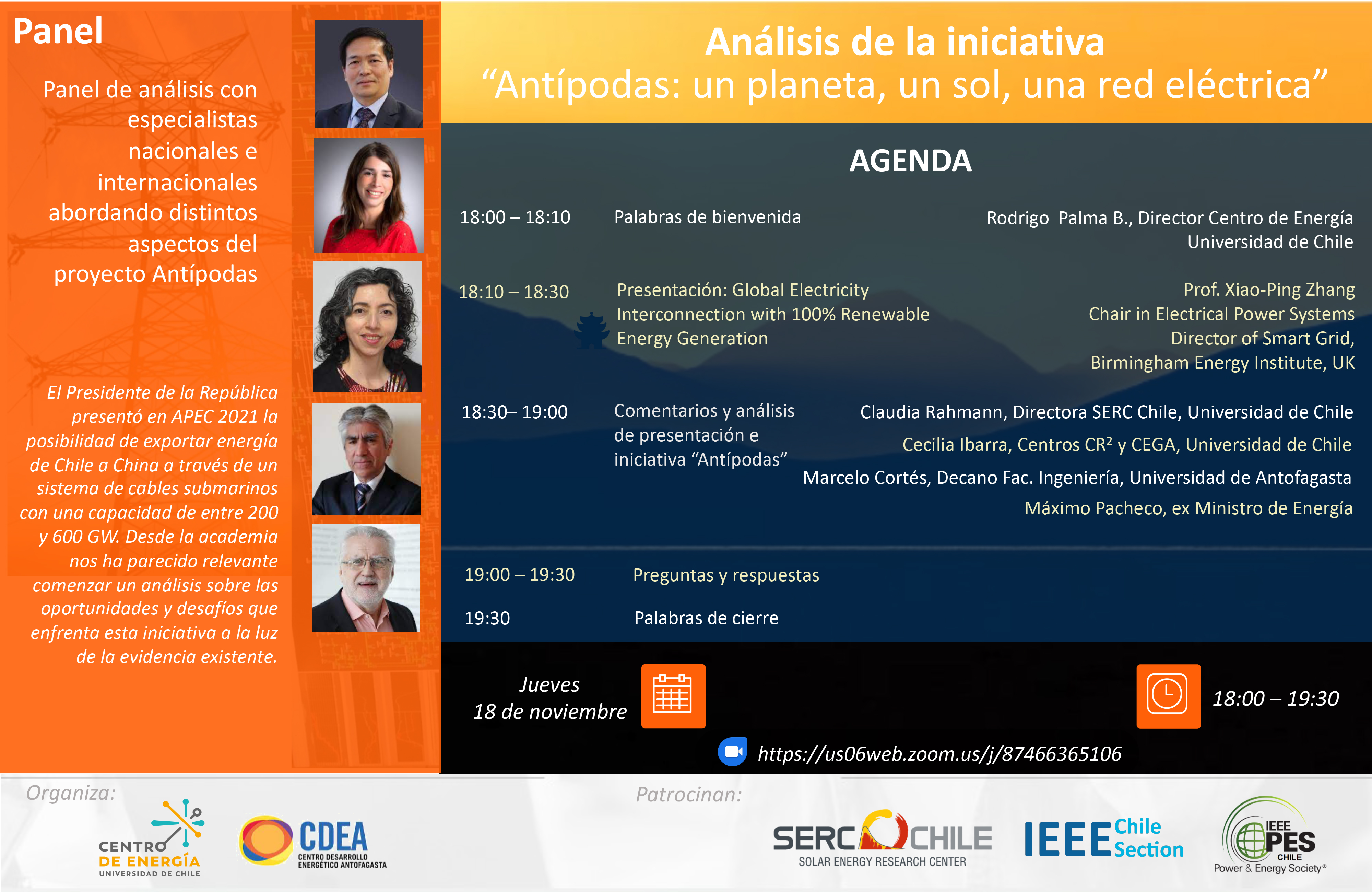 El Centro de Energía de la Universidad de Chile y el Centro de Desarrollo Energético Antofagasta tiene el agrado de invitar a la actividad «Análisis de la iniciativa Antípodas: un planeta, un sol, una red eléctrica».
