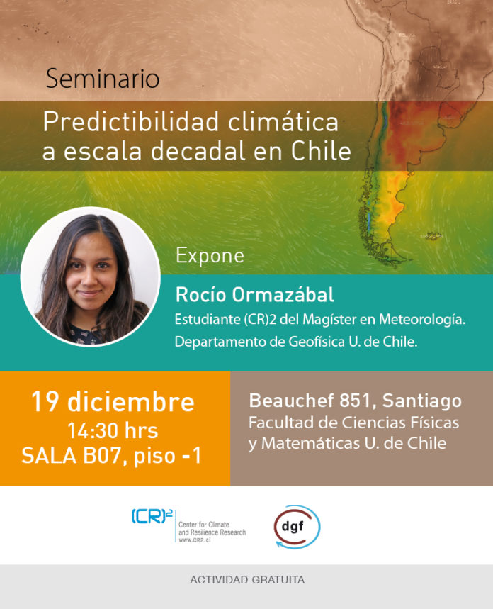 El Centro de Ciencia del Clima y la Resiliencia (CR)2 y el Departamento de Geofísica U. de Chile, invitan al seminario «Predictibilidad climática a escala decadal en Chile” dictado por Rocío Ormazábal, estudiante (CR)2 del Magíster en Meteorología del Departamento de Geofísica U. de Chile.