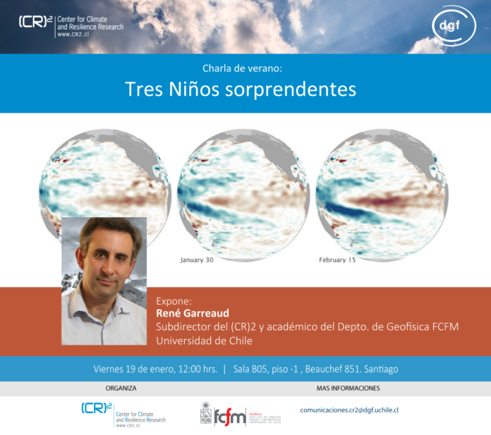 El Centro de Ciencia del Clima y la Resiliencia (CR)2 y el Departamento de Geofísica FCFM. U. de Chile invitan al seminario “Tres Niños sorprendentes», el cual será dictado por René Garreaud, subdirector del (CR)2 y académico del Depto. de Geofísica FCFM U. de Chile.