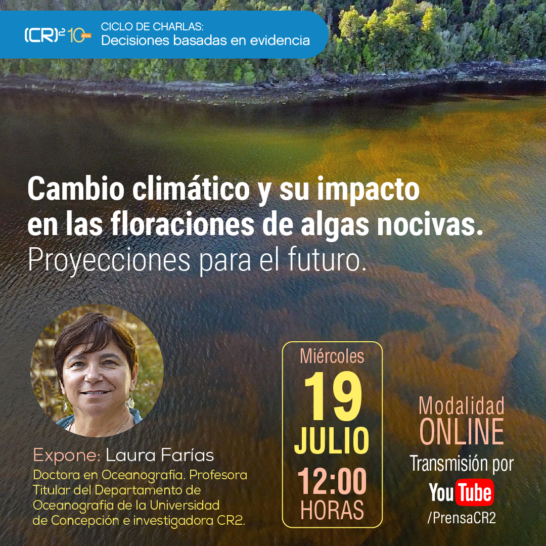 En el contexto del ciclo de charlas CR2 «Decisiones basadas en evidencia», este miércoles 19 de julio se realizará la presentación de «Cambio climático y su impacto en las floraciones de algas nocivas. Proyecciones para el futuro», realizada por Laura Farías, investigadora CR2, doctora en oceanografía y profesora titular del departamento de Oceanografía de la Universidad de Concepción.