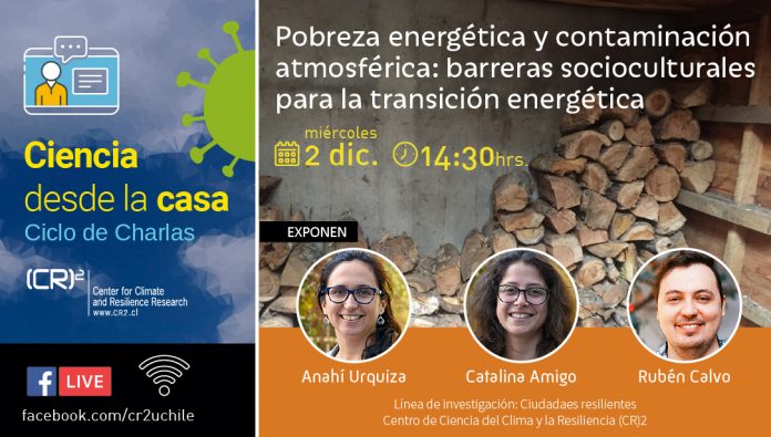 El Centro de Ciencia del Clima y la Resiliencia (CR)2 tienen el agrado de invitar al ciclo de charlas «Ciencia desde la casa», iniciativa completamente online que tiene como objetivo de divulgar la investigación que se realiza en el Centro. Nos acompañarán en esta oportunidad Anahí Urquiza, investigadora del (CR)2, coordinadora de la Red de Pobreza energética y académica de FACSO U. de Chile, Catalina Amigo, estudiante del (CR)2 y coordinadora ejecutiva de la Red de Pobreza Energética, y Rubén Calvo, estudiante del (CR)2 e investigador de la Red de Pobreza Energética, con la charla «Pobreza energética y contaminación atmosférica: barreras socioculturales para la transición energética».