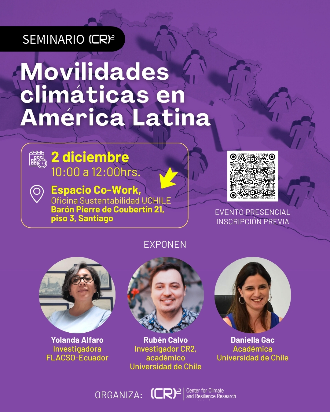 El seminario «Movilidades climáticas en América Latina» organizado por el Centro de Ciencia del Clima y la Resiliencia CR2, busca reunir diferentes voces que aborden los desplazamientos de personas forzados por los impactos del cambio climático, como desastres naturales más frecuentes y severos (huracanes, sequías, inundaciones) y degradación ambiental gradual. Este fenómeno es complejo, ya que interactúa con factores como la inseguridad, la violencia, la pobreza y la falta de oportunidades, particularmente en regiones vulnerables del mundo, como América Latina.