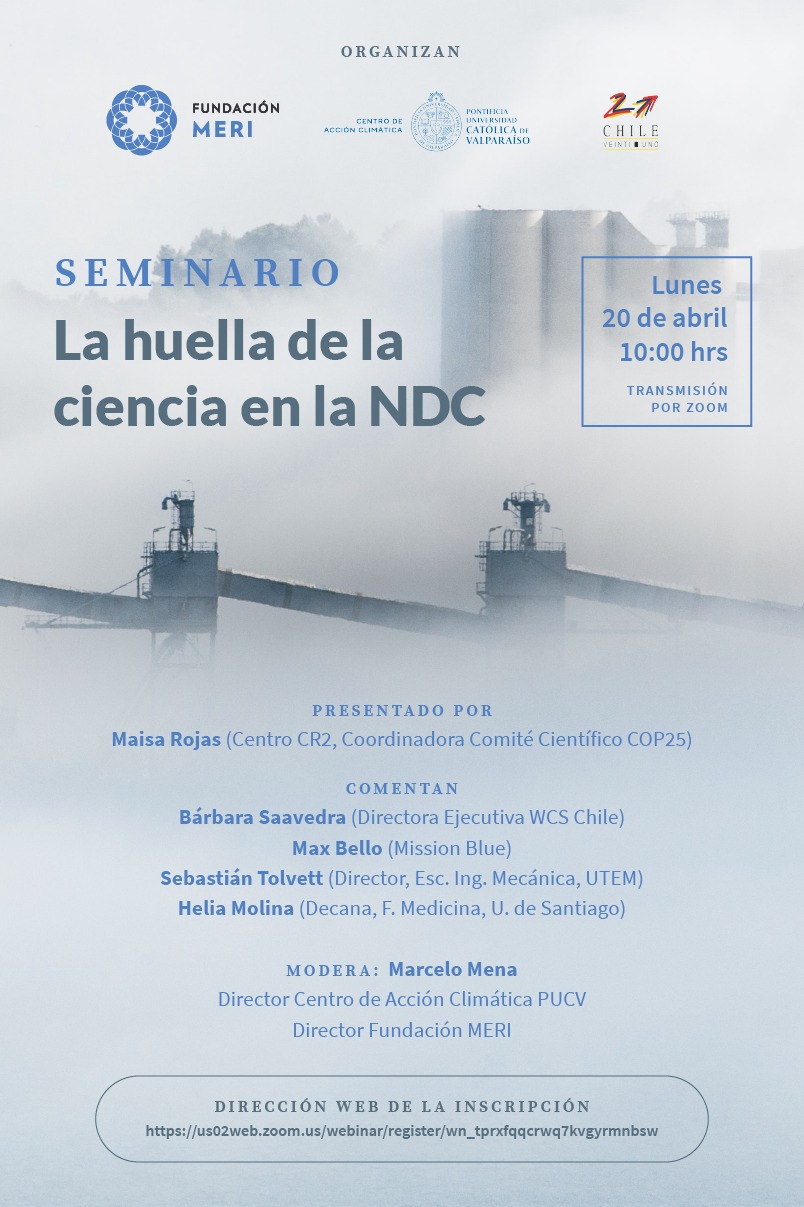 En torno a la importancia de la evidencia científica en la formulación de estas metas conversarán expertos nacionales en la charla “La huella de la ciencia en la NDC”, presentada por Maisa Rojas, Directora Centro CR2, U. Chile y Coordinadora Comité Científico COP25, y moderada por Marcelo Mena, Director Centro de Acción Climática PUCV y Director de Fundación MERI.