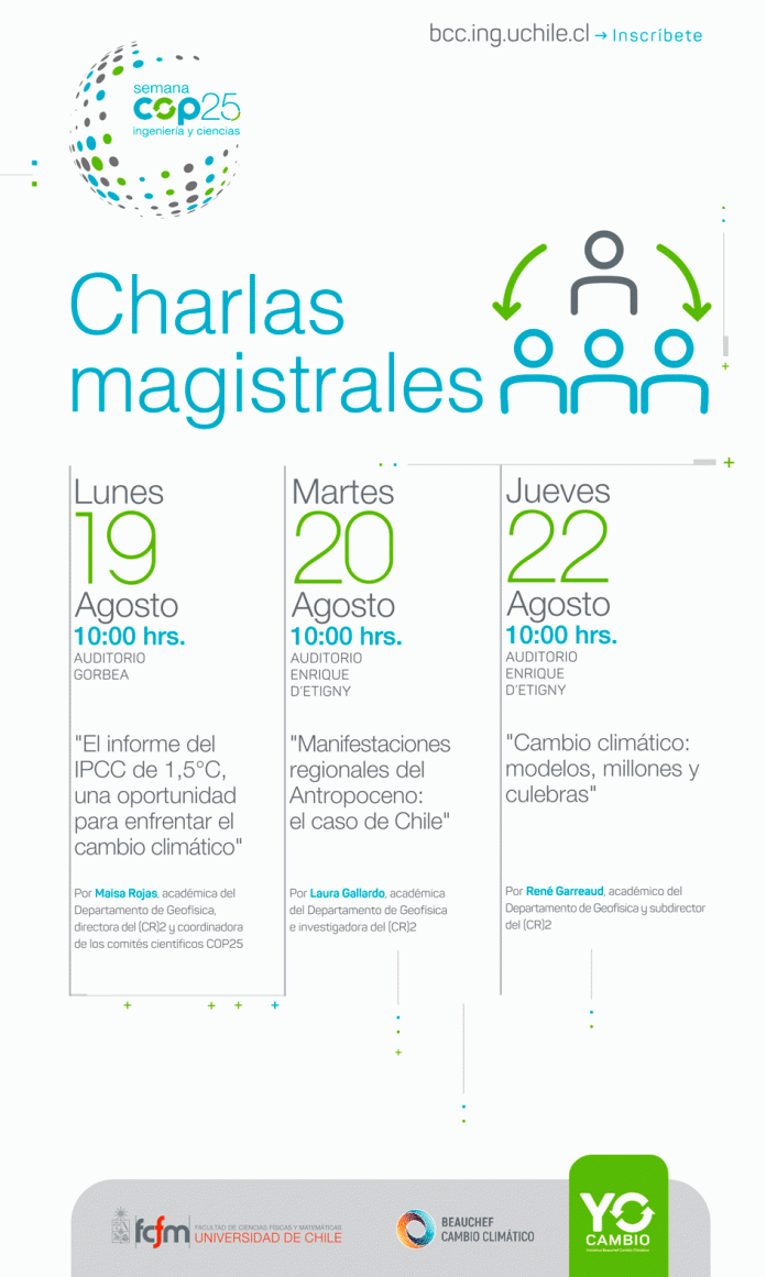 En el marco de la Semana COP25, Ingeniería y Ciencias, la iniciativa Beauchef Cambio Climático de la FCFM, U. de Chile, invita a la charla magistral «Manifestaciones regionales del Antropoceno: el caso de Chile», dictada por Laura Gallardo, investigadora principal del (CR)2.