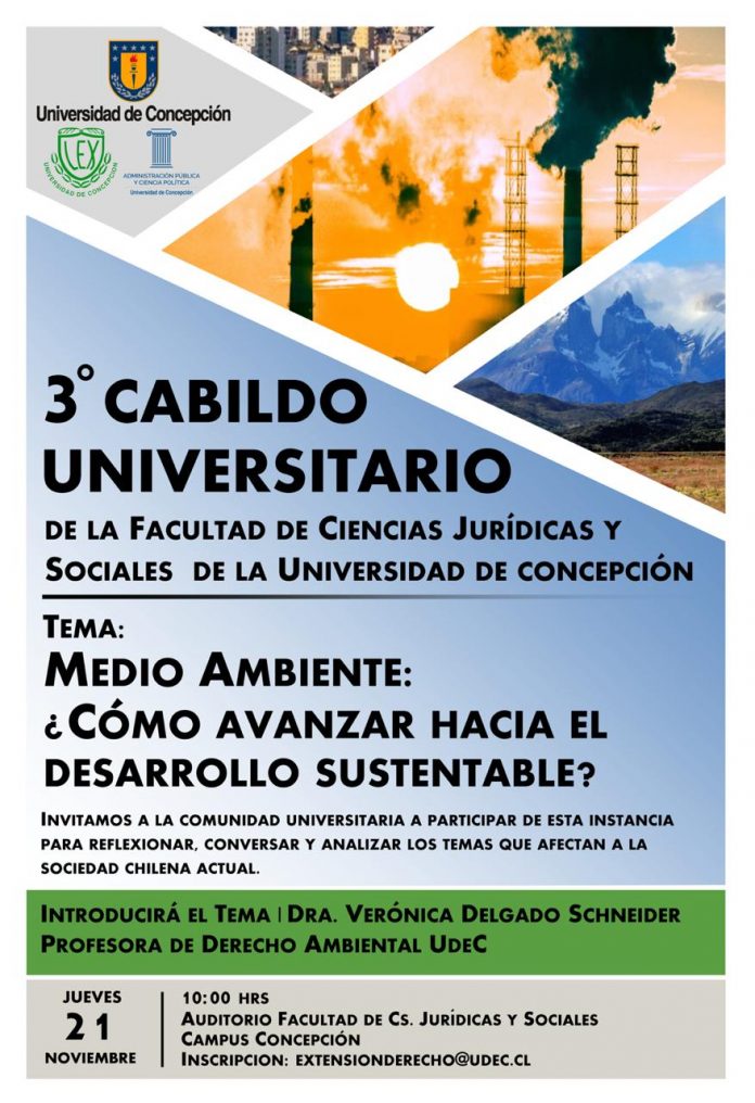 La Facultad de Ciencias Sociales y Jurídicas de la Universidad de Concepción invitan al 3° Cabildo Universitario «Medio Ambiente: ¿cómo avanzar hacia el desarrollo sustentable?», que se realizará este jueves 21 de noviembre a las 10:00 hrs, en Auditorio de la Facultad de Ciencias Sociales y Jurídicas UdeC.
