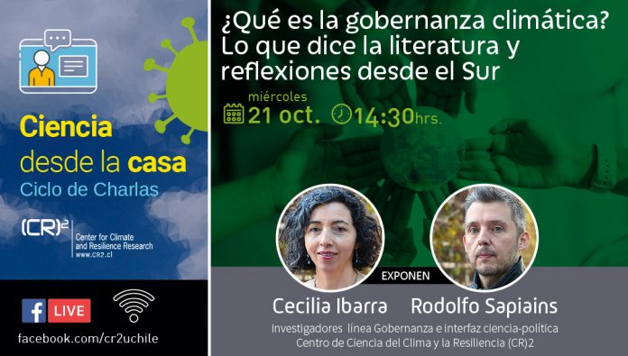 El Centro de Ciencia del Clima y la Resiliencia (CR)2 tienen el agrado de invitar al ciclo de charlas «Ciencia desde la casa», iniciativa completamente online que tiene como objetivo de divulgar la investigación que se realiza en el Centro. Nos acompañarán en esta oportunidad los investigadores de la Línea de Gobernanza e Interfaz Ciencia-Política del (CR)2 Cecilia Ibarra, académica del MBE U. de Chile, y Rodolfo Sapiains, académico de FACSO U. de Chile, con la charla «¿Qué es la gobernanza climática? Lo que dice la literatura y reflexiones desde el Sur».