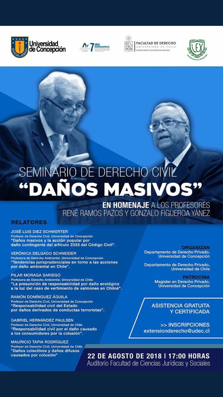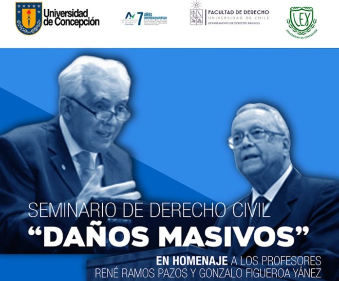 La Facultad de Derecho de la Universidad de Concepción invita a participar del Seminario de Derecho Civil «Daños Masivos», que se realizará el miércoles 22 de agosto de 2018, en homenaje a los profesores René Ramos Pazos y Gonzalo Figueroa Yañez. La actividad comenzará a las 17:00 hrs. y se realizará en el Auditorio de la Facultad de Derecho de la Universidad de Concepción.