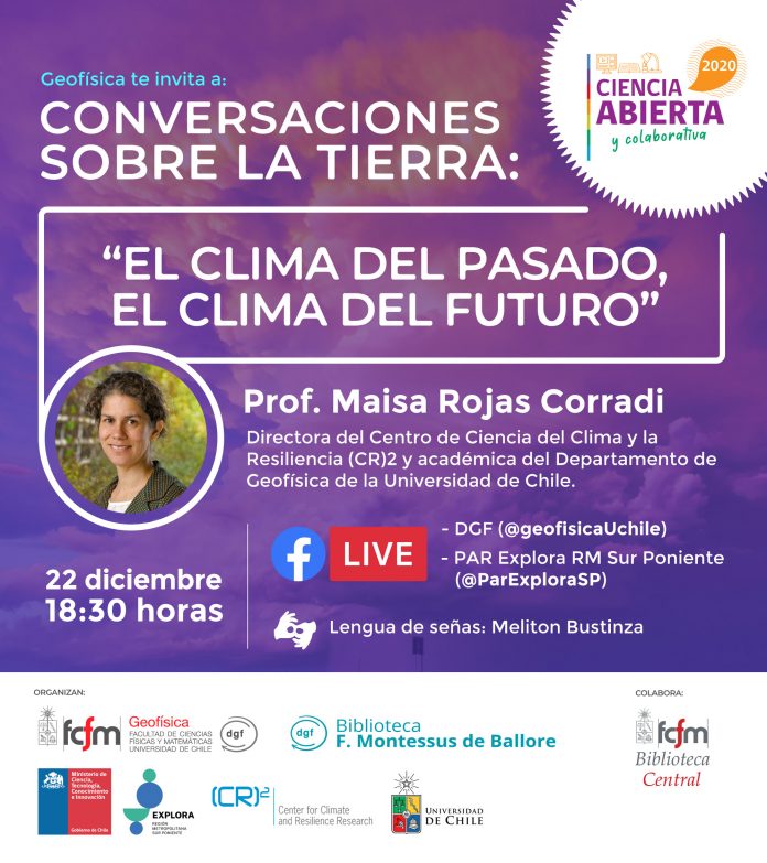El Departamento de Geofísica FCFM U. de Chile, la Biblioteca F. Montessus de Balore y el Par Explora RM Sur Poniente tienen el agrado de invitar al ciclo de charlas «Conversaciones sobre la tierra». En esta ocasión nos acompañará Maisa Rojas, directora del (CR)2 y académica del Departamento de Geofísica FCFM U. de Chile, con la charla «El clima del pasado, el clima del futuro».