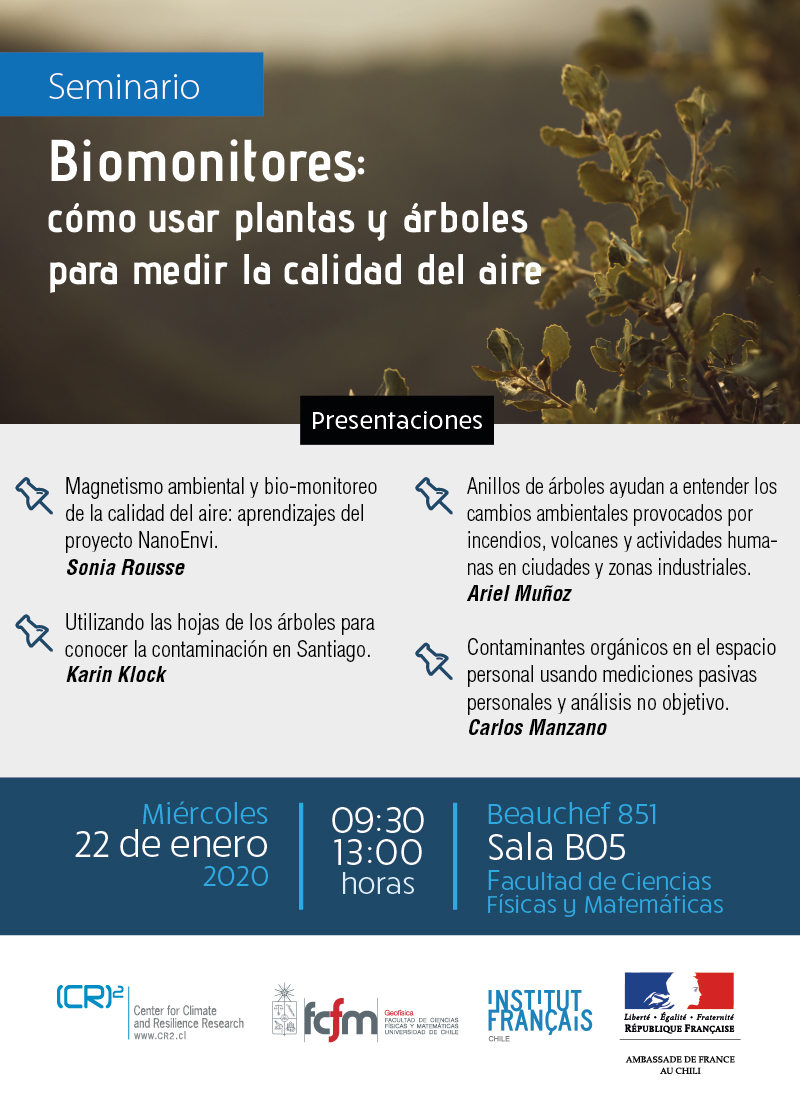 El Centro de Ciencia del Clima y la Resiliencia (CR)2, el Departamento de Geofísica FCFM de la Universidad de Chile, la Embajada de Francia y el Instituto Francés de Chile invitan al seminario «Biomonitores: cómo usar plantas y árboles para medir la calidad del aire», que se realizará el miércoles 22 de enero de 09:30 a 13:00 hrs en la sala B05 del edificio Beauchef 851 de la Facultad de Ciencias Físicas y Matemáticas de la Universidad de Chile.