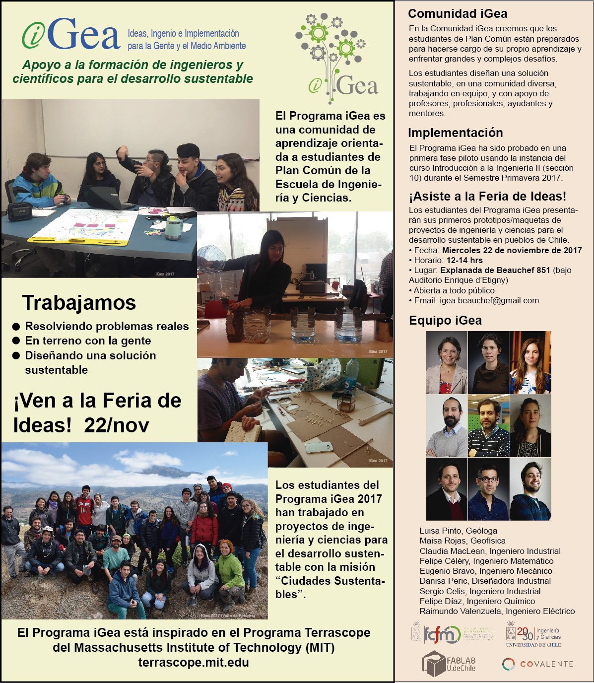 Los/as estudiantes del Programa iGea 2017 invitan a participar este miércoles 22 de noviembre a partir de las 12:14 hrs. en la Feria de Ideas, que se realizará en la Explanada de Beauchef 851 (bajo Auditorio Enrique d’Etigny).