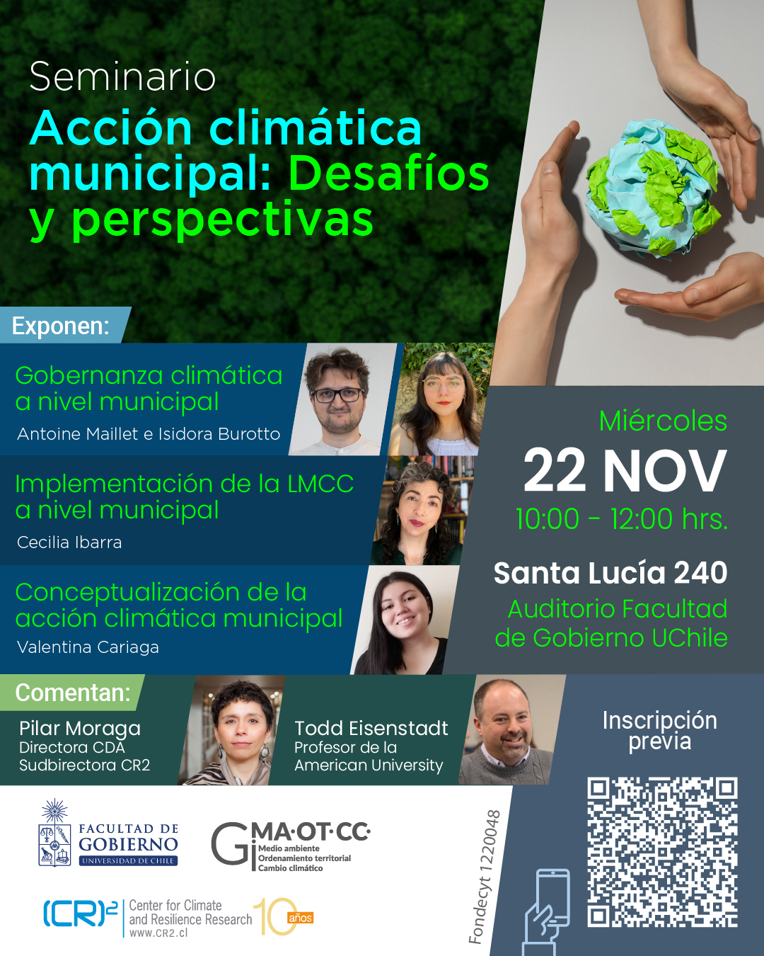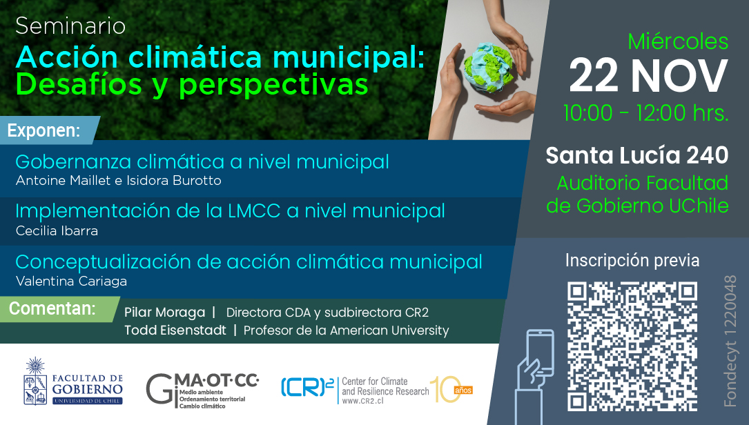 La actividad contará con tres presentaciones de investigaciones en curso realizadas por representantes del CR2 y la Facultad de Gobierno, además de los comentarios de Pilar Moraga directora del Centro de Derecho Ambiental y sudbirectora CR2) y Todd Eisenstadt, profesor de la American University y especialista en política climática.