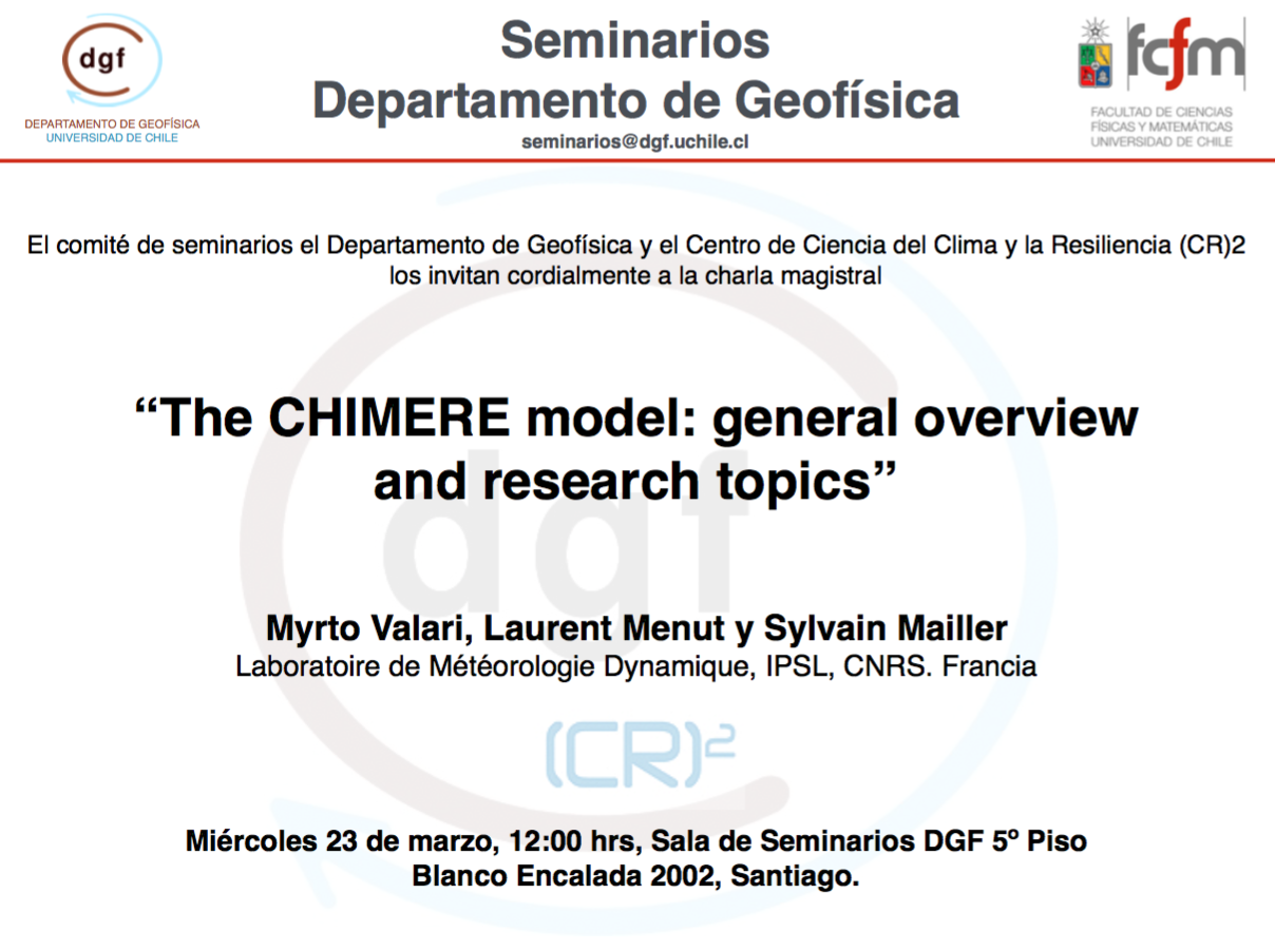 El DGF FCFM y el (CR)2 invitan este miércoles 23 de marzo al mediodía a la charla «The CHIMERE model: general overview and research topics», dictada por Myrto Valari, Laurent Menut y Sylvain Mailler, todos del Laboratoire de Météorologie Dynamique, IPSL, CNRS. Francia.