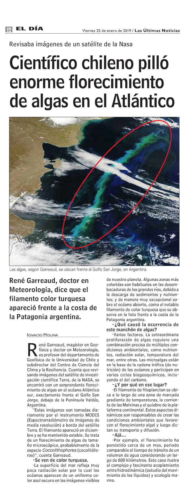 René Garreaud, magíster en Geofísica y doctor en Meteorología, es profesor del departamento de Geofísica de la Universidad de Chile y subdirector del Centro de Ciencia del Clima y la Resiliencia. Cuenta que revisando imágenes del satélite de investigación científica Terra, de la NASA, se encontró con un sorprendente florecimiento de algas en el océano Atlántico sur, exactamente frente al Golfo San Jorge, debajo de la Península Valdés, Argentina.