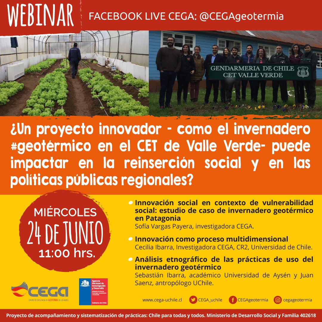 El Centro de Excelencia en Geotermia de los Andes – CEGA, invita este miércoles 24 de junio a las 11:00 horas al webinar «¿Un proyecto innovador puede impactar en la reinserción social y en las políticas públicas?», que será transmitido por Facebook Live en la cuenta de Facebook de CEGA.