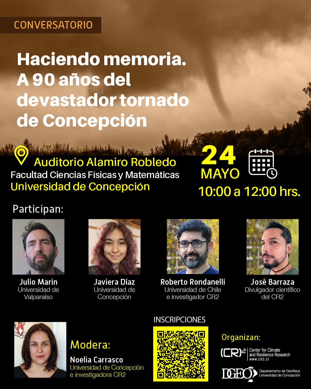 10:45 hrs. Panel “A 90 años del tornado de Concepción”, Javiera Díaz, licenciada en Historia, Universidad de Concepción; Roberto Rondanelli, académico del Departamento de Geofísica de la Universidad de Chile e investigador del CR2; José Barraza, divulgador científico del CR2. Modera: Noelia Carrasco, académica del Departamento de Historia de la Universidad de Concepción e investigadora del CR2.