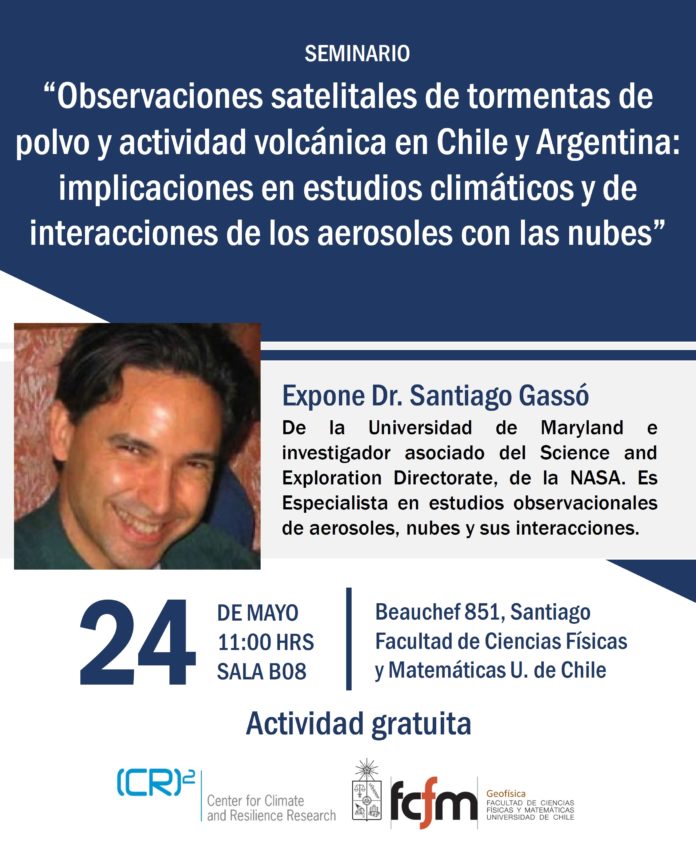 El Centro de Ciencia del Clima y la Resiliencia (CR)2 invita al seminario «Observaciones satelitales de tormentas de polvo y actividad volcánica en Chile y Argentina: implicaciones en estudios climáticos y de interacciones de los aerosoles con las nubes», dictado por Santiago Gassó, de la Universidad de Maryland e investigador asociado del Science and Exploration Directorate, de la NASA. Es Especialista en estudios observacionales de aerosoles, nubes y sus interacciones.