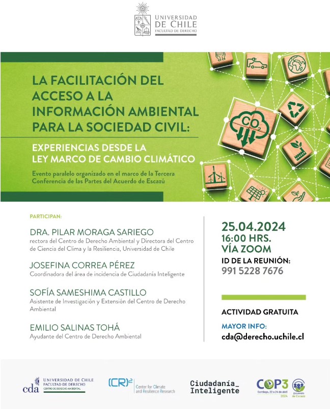 La actividad, organizada entre el @CDA_UChile, el @CR2.UChile y @CiudadaniaI, contará con las exposiciones de la Dra. Pilar Moraga Sariego (directora del Centro de Derecho Ambiental y del Centro de Ciencia del Clima y la Resiliencia), Josefina Correa Pérez (Coordinadora del Área de Incidencia de Ciudadanía Inteligente), Sofía Sameshima Castillo (Asistente de Investigación y Extensión del Centro de Derecho Ambiental) y Emilio Salinas Tohá (Ayudante del Centro de Derecho Ambiental).
