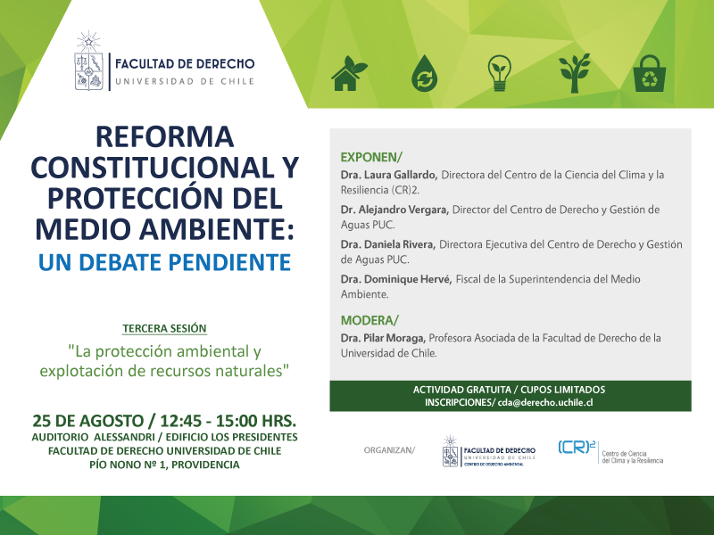 La Facultad de Derecho de la Universidad de Chile, el Centro de Derecho Ambiental y el (CR)2 invitan a la tercera sesión del ciclo de charlas «Reforma Constitucional y Protección del Medio Ambiente: un debate pendiente».