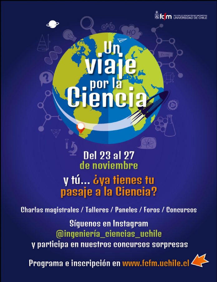 Entre el 23 y el 27 de noviembre la Facultad de Ciencias Físicas y Matemáticas de la Universidad de Chile realizará «Un viaje por la ciencia», evento de divulgación científica para escolares que contempla la realización de talleres, foros, paneles y charlas magistrales dictadas por académicos/as e investigadores/as de la FCFM.