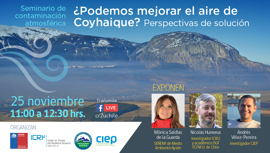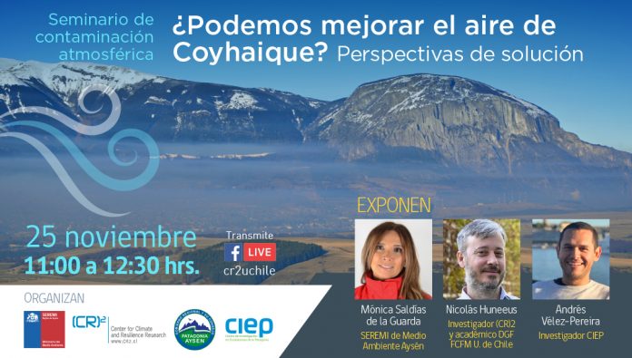 El Centro de Ciencia del Clima y la Resiliencia (CR)2, junto al Centro de Investigación en Ecosistemas de la Patagonia – CIEP y la Seremi de Medio Ambiente de la Región de Aysén, tienen el agrado de invitar al seminario de Contaminación Atmosférica «¿Podemos mejorar el aire de Coyhaique? Perspectivas de solución».